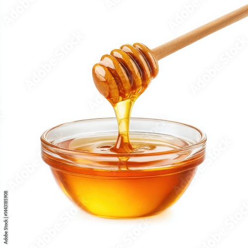 Honey dripping from dipper isolated on white background