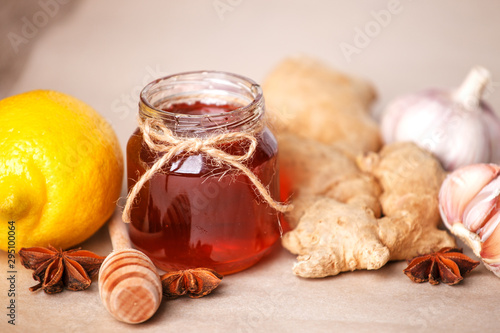Honey, ginger, garlic and lemon, healthy products for fast recovery. Homemade antimicrobial therapy. Ingredients for healthy tea, seasonal flu remedy drink