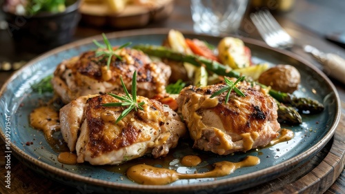 Honey mustard chicken thighs with caramelized glaze and rosemary garnish served on ceramic plate with roasted vegetables and golden sauce drizzle