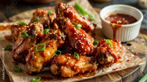 Honey sriracha wings with sesame seeds and green onions on parchment paper, glazed chicken wings with dipping sauce on wooden board, spicy sweet appetizer food photography