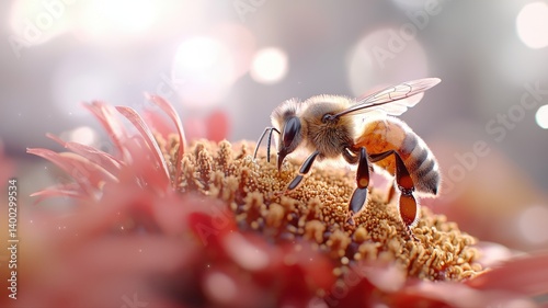 Honeybee collecting pollen on vibrant flower under sunlight.