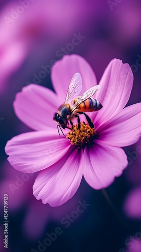 Honeybee Pollinating a Vibrant Pink Cosmos Flower in Soft Sunlight