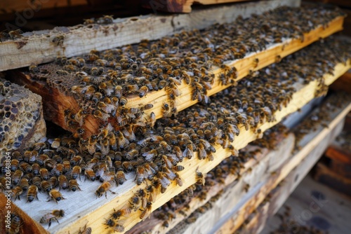 Honeybees Inside a Beehive Working on Honeycomb