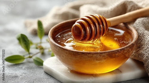 Honeycomb and glass bowl containing golden honey with dipper resting inside on concrete surface