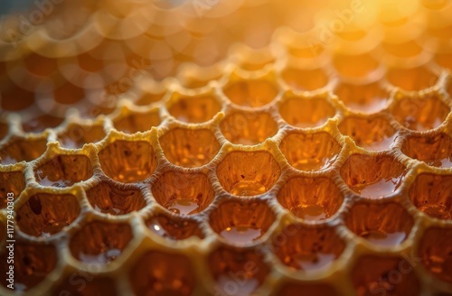 Honeycomb, macro background with sweet golden honey inside, close up. Texture and pattern wax sections. Commercial for honey sale background or banner concept
