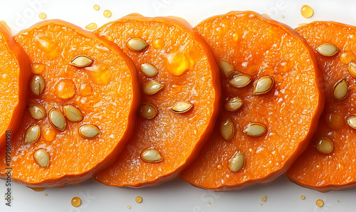 Honey-glazed pumpkin slices, seeds, white background, food photography, recipe