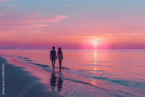 Honeymoon couple romantic in love at beach sunset. Newlywed happy young couple. Neural network ai generated