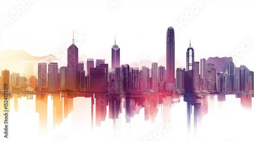 Hong kong city skyline with Asia sleek silhouettes on white background