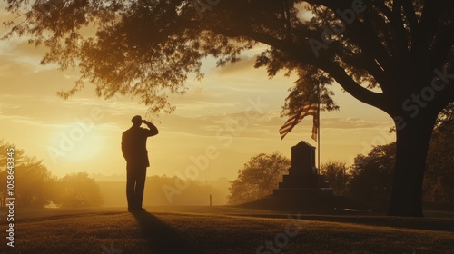 Honoring Veterans: Soldier Saluting at War Memorial during Sunrise with Patriotic Flag Raising Ceremony in Dawn Light