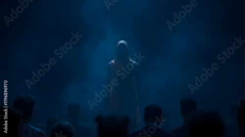 Hooded Figure Mysterious Stage Presence Blue Lit Audience