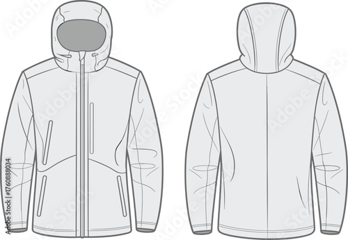 Hooded, jacket, coat, outerwear, hoodie, fashion, apparel, clothing, garment, textile, CAD, drawing, flat, vector, illustration, design, tailoring, sewing, silhouette, template, pattern
