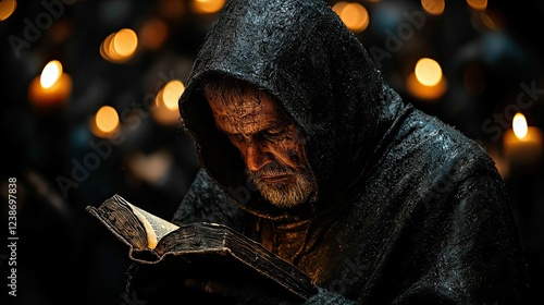 Hooded Monk Reading Ancient Book By Candlelight