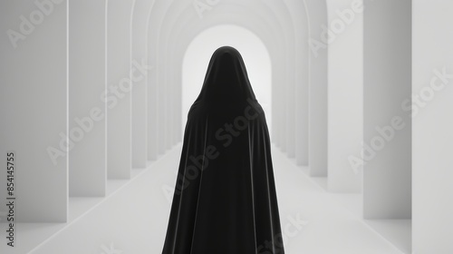 Hooded priest in dark attire walking away on a stark white background, captured with volumetric realism, 25mm lens, depth of field, tilt blur, and precise shutter speed