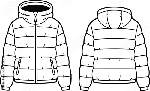 hooded winter outerwear, technical fashion sketch, cold weather apparel design template