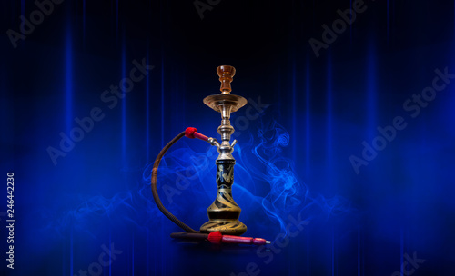 Hookah smoking on a blue futuristic background of an empty room, neon light, smoke