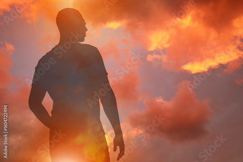 Hope. Silhouette of man under beautiful sky at sunset, double exposure