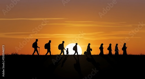 Hopeful Refugees Walking Silhouettes – Conceptual Digital Illustration