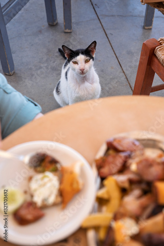 Hopeful stray cat in Greek taverna, Koroni, Messenia, Peloponnese, Greece, Europe