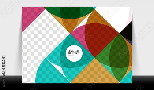 Horizontal A4 business flyer annual report template, circles and triangle style shapes modern geometric design for brochure layout, magazine or booklet