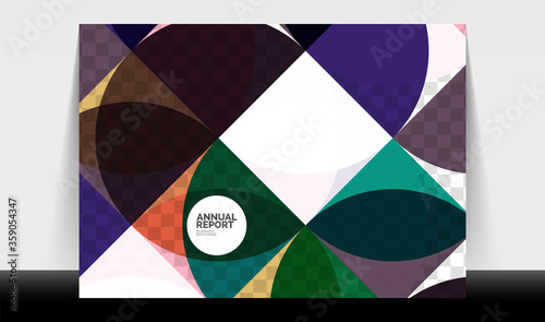 Horizontal A4 business flyer annual report template, circles and triangle style shapes modern geometric design for brochure layout, magazine or booklet