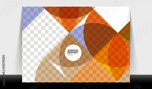 Horizontal A4 business flyer annual report template, circles and triangle style shapes modern geometric design for brochure layout, magazine or booklet