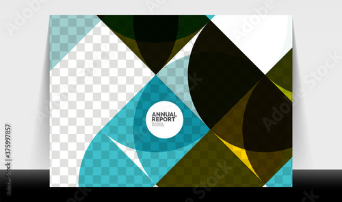 Horizontal A4 business flyer annual report template, circles and triangle style shapes modern geometric design for brochure layout, magazine or booklet