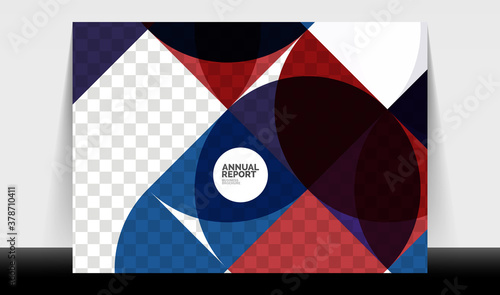 Horizontal A4 business flyer annual report template, circles and triangle style shapes modern geometric design for brochure layout, magazine or booklet