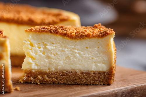 Horizontal close-up of Baku-style cheesecake slice showing thick creamy cheese layer and golden crunchy biscuit crust, detailed texture, warm ambient bakery lighting.