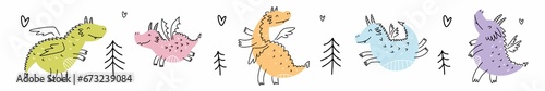 Horizontal collection of cute dragons hand-drawn in the style of doodles