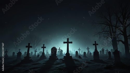 Horizontal eerie Halloween cemetery background with fog and minimal style