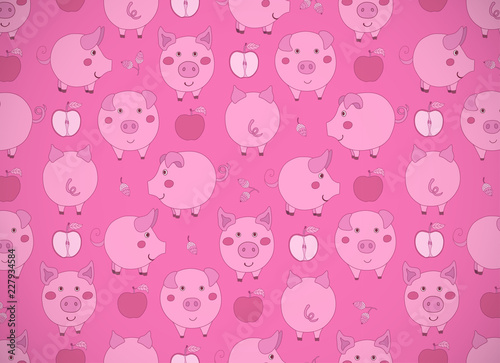 Horizontal greeting card with cute cartoon pink pigs, apples and acorns on dark pink. Vector