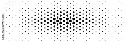 horizontal halftone of black six angles star spread from center for pattern and background.