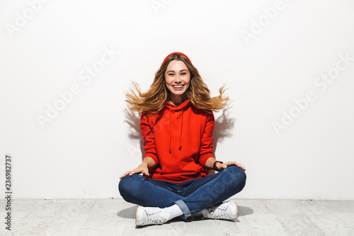 Horizontal photo of happy woman 20s wearing casual clothes smiling while sitting on floor with legs crossed, isolated over white background