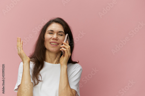 horizontal portrait of a funny woman in a white cotton T-shirt happily talking on the phone with her eyes closed. Photo on an empty background with space for an advertising layout