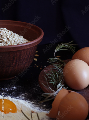 Horizontal view. Eggs, rosemary, flour and oatmeal lie on a clay tray. Dark background Ingredients for cooking homemade, delicious breakfast food