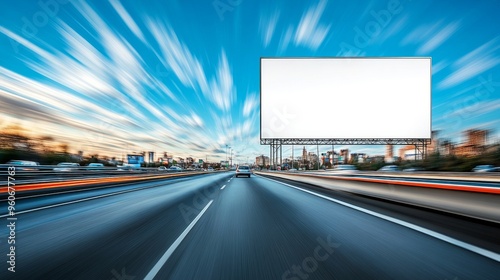 Horizontal white blank billboard sign on street, sky in background, empty poster board outdoors, mockup of commercial advertisement, cars passing by.