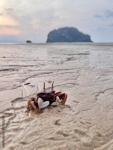 Horned ghost crab (Ocypode ceratophthalmus) or horn-eyed ghost crab, selective focus. Crab on the beach at Koh Yao Yai island, Phang Nga Thailand