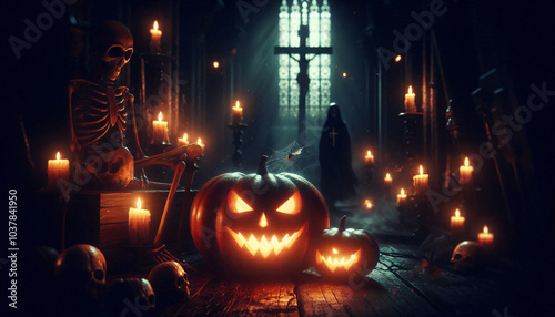 horror halloween atmosphere in haunted church at dark, skeleton , demon, walking dead, devil, ghost cleric
