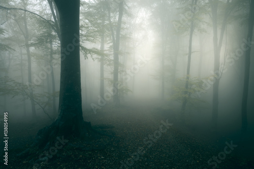 Horror trail in spooky foggy forest during a gloomy day