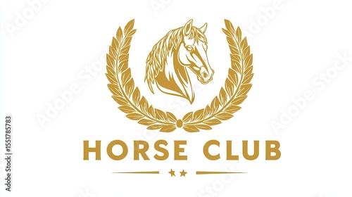 Horse club emblem with golden stallion head and laurel wreath on white background in vintage design