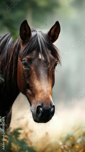 Horse gazing calmly in a tranquil forest environment during early morning light