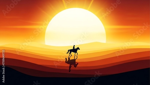Horse riding silhouette at sunset landscape vector illustration wallpaper background for desktop and mobile art