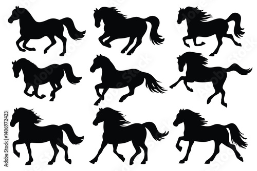 Horse running black silhouettes set isolated flat vector illustration on white background.