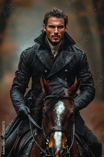 Horseback rider in leather coat navigating through a blurred wooded area, fall scenery
