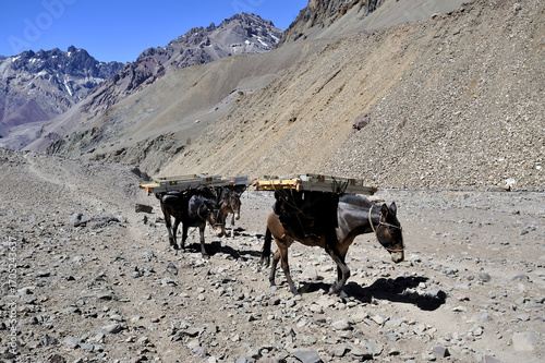 Horsemen in a river valley in the desert between the mountains. Gray mountains. Bare mountainous terrain