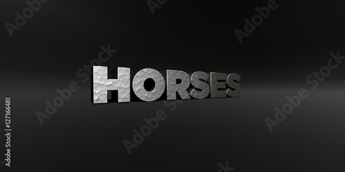 HORSES - hammered metal finish text on black studio - 3D rendered royalty free stock photo. This image can be used for an online website banner ad or a print postcard.