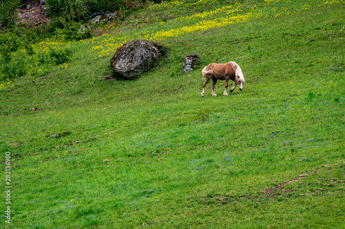Horses on an hill in green grass in Austria