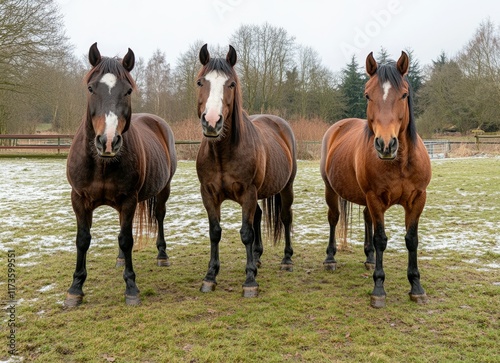 Horses standing together in a grassy field during a chilly winter day in a peaceful countryside setting