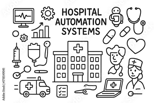 Hospital Automation Doodles. Hand-drawn doodle illustration Hospital automation systems [hospital building, monitor, chart, gear, robot, stethoscope, pill,
