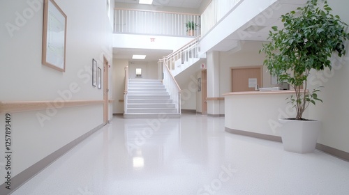 Hospital Interior Corridor with Staircase, Clean and Modern Ambiance